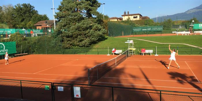 Spiele auf einer der schönsten Tennisanlagen der Schweiz. Die Allwetterplätze ermöglichen die eine lange Sandplatzsaison.